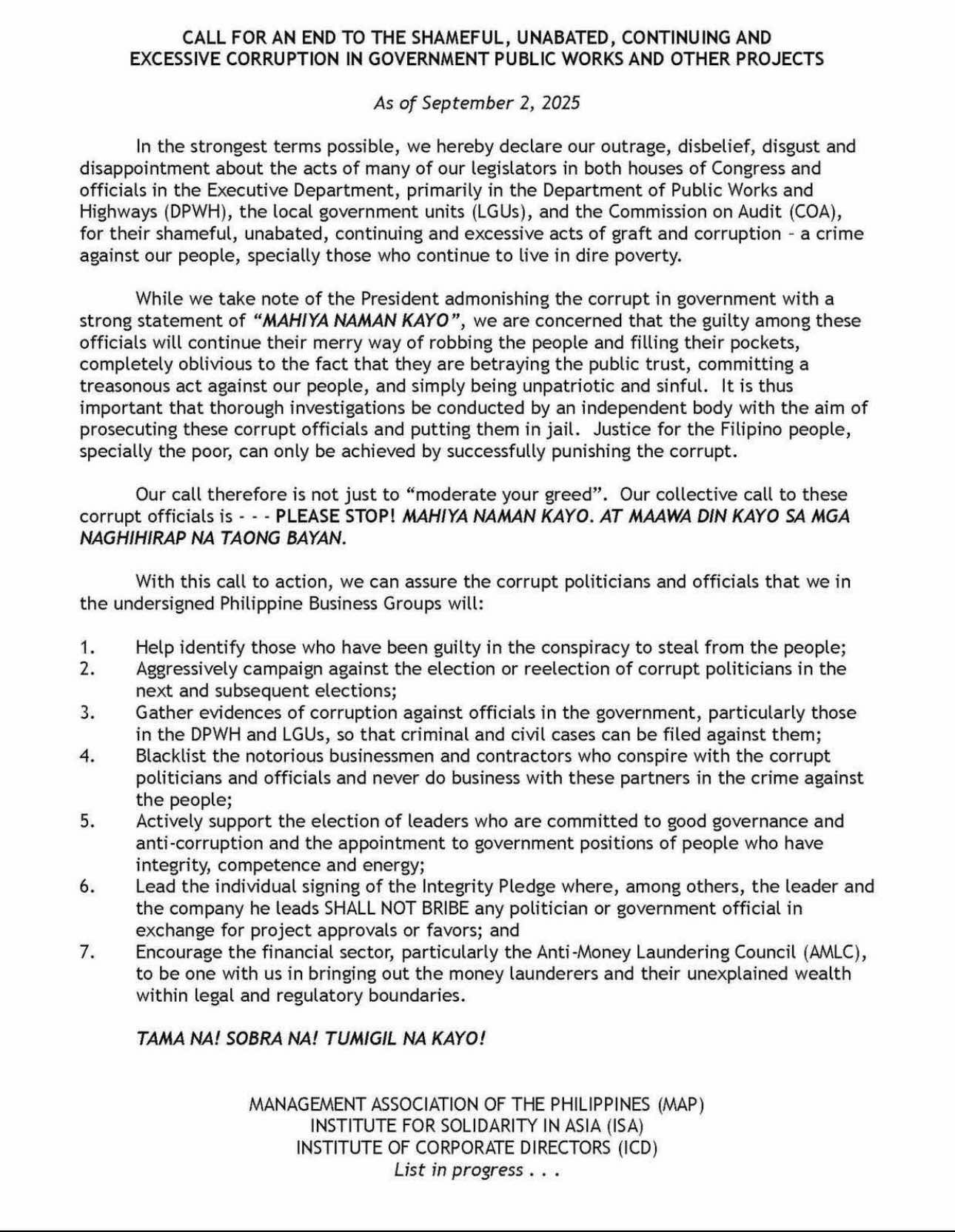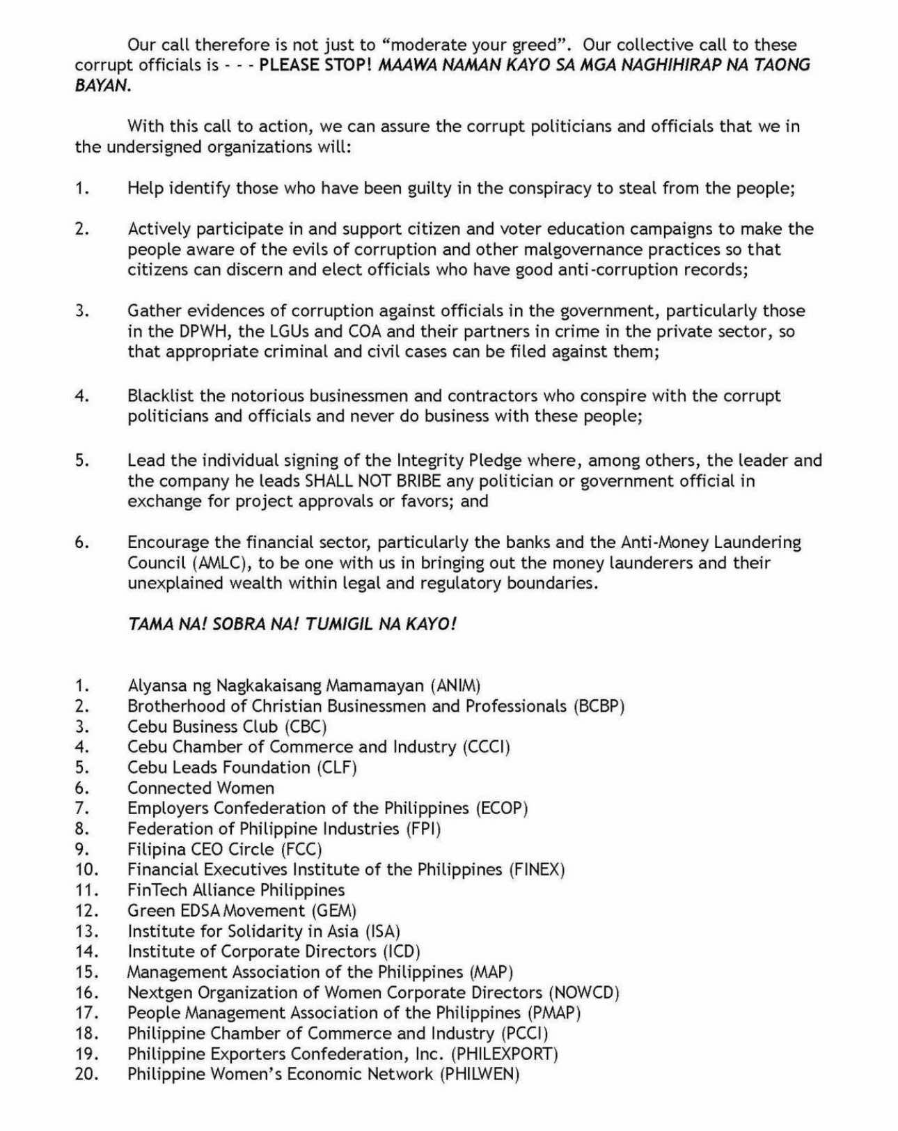 At least 20 of the Philippines’ largest business, civic and professional groups on Thursday issued a joint manifesto condemning what they described as “shameful, unabated, continuing, and excessive” corruption in government infrastructure projects, vowing to hold officials and contractors accountable.