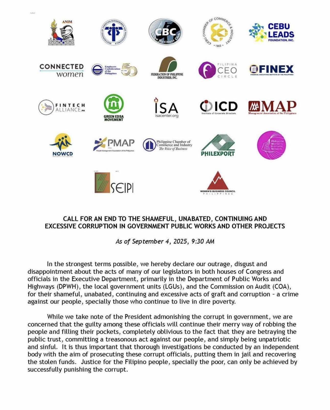 Signatories to the manifesto include the Management Association of the Philippines, Philippine Chamber of Commerce and Industry, Employers Confederation of the Philippines, Cebu Chamber of Commerce and Industry, the Financial Executives Institute of the Philippines, and other national and regional groups.